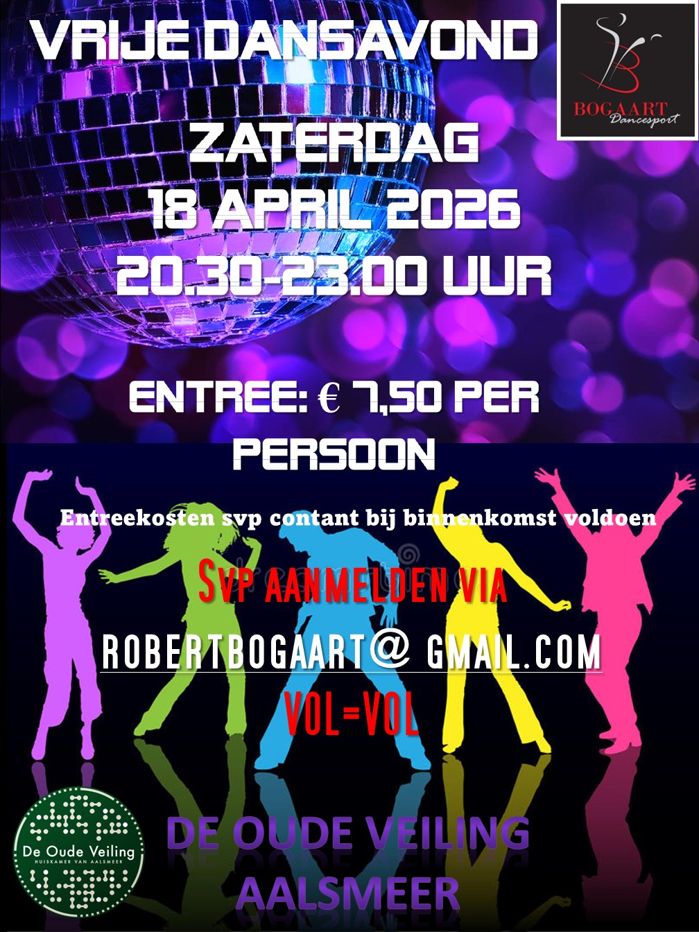 De avonden starten om 20.30 uur en duurt tot 23.00 uur. Wij willen u vragen om u via mail of telefonisch via WhatsApp (0623427860) aan te melden voor deze dansavonden. De kosten hiervoor zijn € 7,50 per persoon voor de reguliere dansavonden.